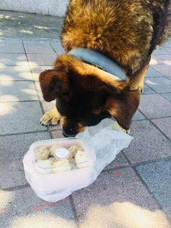 為了社團的另一隻狗準備的手工鮮食,半路偶遇太郎就被攔截了幾顆肉丸。太狼就好像是安檢人員一樣,盯著我手上的便當盒,硬是想要檢查一下。