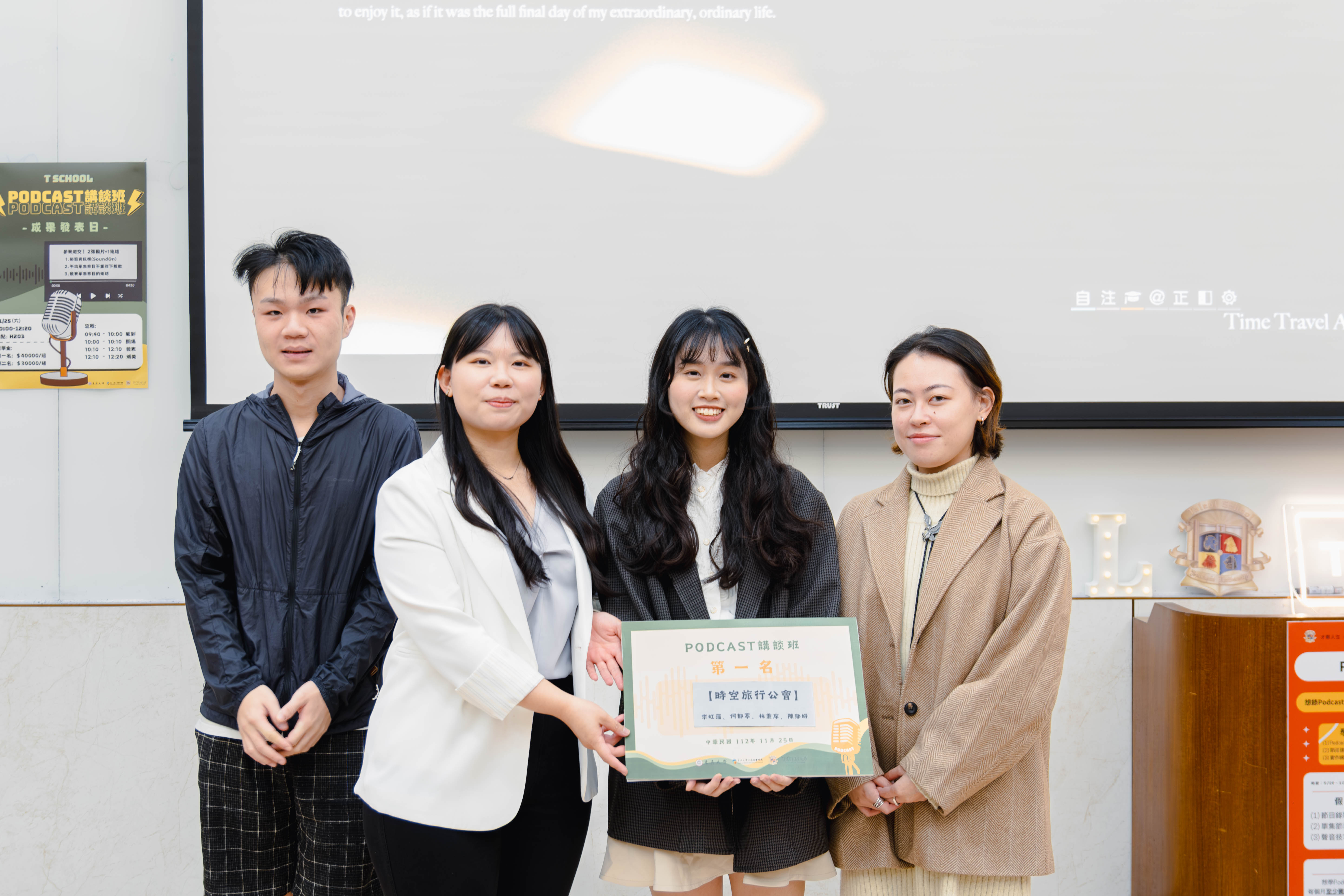 特別是在Podcast 的製作過程,擁有許多與外系夥伴交流的機會,在真正要錄音的時候,我才終於意識到,說話其實有更多玄妙之處,為了製作吸引聽眾的節目,在內容、編排,甚至是主持人的聲音與剪輯之各方面,都必須詳實計畫,我很幸運在這一學期的課程中,認識志趣相投的朋友,最終共同完成了初步的系列創作。