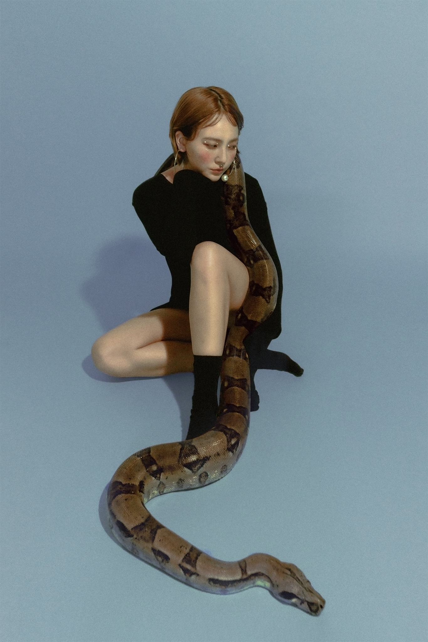 而誤打誤撞兩年多前開始擔任平面模特自己,或許正是最接近所謂創作的時刻。每一次的拍攝都像場挑戰,簡略的想法,甚至是抽象的情感該如何透過道具、妝髮、肢體去拚湊出完整的畫面。在這過程中我時常因為能力不足而感到挫敗;也曾因為無法將腦中的想像產出而感到焦慮,然而創作正是環環相扣的,巧妙地將自我與團體連結,不得不在這段過程中試著跟自身對話,只為了挖掘出連自己也認不清的那些靈感碎片。
