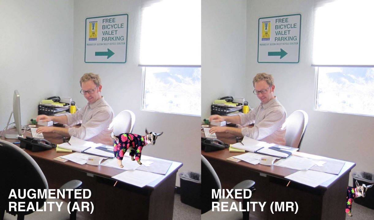 也因此常見到網路上有人說:「AR、MR、VR傻傻分不清」,其實應該說是「AR與MR分不清」、「VR與360分不清」。如果真的分不清,個人推薦Scottie Gardonio寫的這篇「What’s the Difference Between VR, AR, MR, and 360? Know the difference to make sense of our new digital worlds」,看完就能搞清楚。但本篇會特別聚焦在AR與MR的差異上,相信只要引用上文中的這張圖就很清楚(見下圖),在此也做MR的簡單定義如下:
