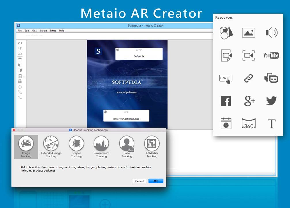 其實AR的應用早於MR甚至VR很久,AR的使用技術與觀念也因著新科技發展,特別是「空間偵測」、「即時運算」、「行動裝置」、「頭戴式顯示器」等技術的發展,才使數位化的虛實整合有了全新的面貌,也才會有所謂MR的出現,相對的,而AR的下一階段的應用,也勢必仰賴具有「空間偵測」功能的MR。下面這張圖要說明的是「Metaio AR」這款具有圖形化介面的簡易AR製作軟體,在被Apple 併購前之最後版本的功能介面。不妨仔細看一下,這張圖上共顯示Metaio AR的兩大基本功能,那就是掃描偵測(Tracking)以及呈像來源(Resource),而這些可以說幾乎是AR所能做的事。簡單說明如下: