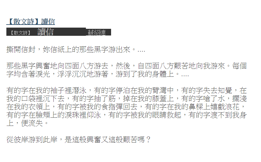 散文化的詩之所以成立,其實靠得不是一般詩的方法──意象,而是以字與字之間的關係為主要方法,表現出來的文字不夠大膽,卻可以像是小小的撕裂什麼一樣,當小小的撕裂在詩行的每個段落都出現時,便會累積成一種多數的感覺,讓人陷入在裡面,不能自己。