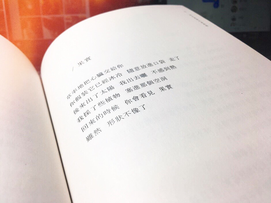 葉青也是這樣的,<果實>(節錄)裡面說:「草率地把心臟交給你/你假裝它已經冰冷/隨意放進口袋/走了/後來出了太陽/我出去曬/不感到熱」,詩集本身編排只有三行,卻講出了許多事情,讀者本身就會把自己帶入詩裡面,成為主角,而「把心臟交給你」,本身就是極為抽象的事情,卻又要假裝冰冷,與心臟的熱量有所衝突,這裡便是一個小撕裂;「我出去曬」與「不感到熱」兩者也相互衝突。
