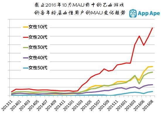 由圖表可以看出2013年11月-2016年8月中,乙女向的玩家規模增長超過13倍,其中以20多歲的玩家(紅線)增加的速度最快,竟高達21倍。