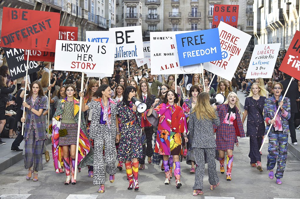 而此次時裝秀的壓軸,則是在謝幕的部分。全體模特兒以遊行的隊伍再度走上伸展台,有的人高舉的貼著香奈兒logo的大聲公呼籲、有的人舉著「History is HER story」、「Be your own stylist」、「Be different」、「Free freedom”…」等標語的牌子,宣示著女權主義與反戰思想。謝幕的遊行巧思剛好與這一季的服裝主旨,即女性崇尚自由與平等,有著一致的主題性連結